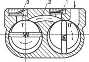 | 雙級(jí)旋片式真空泵工作原理圖 1-高級(jí)排氣閥;2-通道;3-低級(jí)排氣閥 | ||||