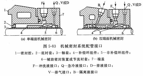 為了防止注入流體的泄漏,需要采用輔助密封,如襯套密封、油封或填料密封。急冷或阻封流體一般用水、蒸汽或氮氣。液體的壓力通常為0.02~0.05 MPa,進(jìn)出口的溫差控制在3~5℃為宜。圖5-83為典型機(jī)械密封系統(tǒng)配管接口,其中包含急冷(阻封)接口及密封急冷液的輔助密封。