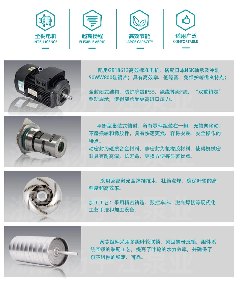 QDL輕型多級(jí)離心泵主要零部件如葉輪、導(dǎo)流器、泵軸、外圓筒用不銹鋼制造,QDL(N)系列所有過(guò)流部件均為不銹鋼制造,具有良好的耐腐蝕性能,采用硬質(zhì)合金軸承及機(jī)械密封,剛性聯(lián)軸器傳動(dòng),具有體積小、重量輕、抗腐蝕、振動(dòng)小、噪音低、占地面積小、使用壽命長(zhǎng),外形美觀等特點(diǎn),特別是高效、節(jié)能等優(yōu)點(diǎn)。