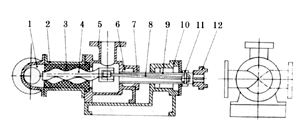 I-1B系列濃漿泵是單螺桿式容積回轉(zhuǎn)泵,該泵利用偏心單螺旋的螺桿在雙螺旋襯套內(nèi)的轉(zhuǎn)動(dòng),使?jié)鉂{液沿螺旋槽由吸入口推移至排出口,實(shí)現(xiàn)泵的輸送功能。