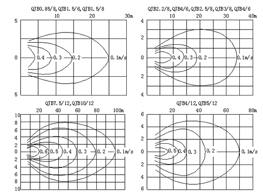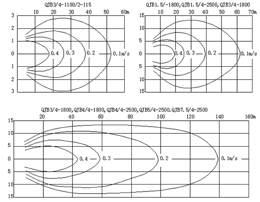 潛水?dāng)嚢铏C(jī)的選型是一項(xiàng)比較復(fù)雜的工作,選型的正確與否直接影響設(shè)備的正常使用,作為選型的原則就是要讓潛水?dāng)嚢铏C(jī)在適合的容積里發(fā)揮充分的攪拌功能,一般可用流速來確定。根據(jù)污水處理廠不同的工藝要求,潛水?dāng)嚢铏C(jī)佳流速應(yīng)保證在0.15~0.3m/s之間,如果低于0.15m/s的流速則達(dá)不到推流攪拌效果,超過0.3m/s的流速則會(huì)影響工藝效果且造成浪費(fèi)。所以在選型前首先確定QJB潛水?dāng)嚢铏C(jī)運(yùn)用的場所,如:污水池、污泥池、生化池;其次是介質(zhì)的參數(shù),如:懸浮物含量、粘度、溫度、PH值;還有水池的形狀、水深甚至安裝方式等都對(duì)選型產(chǎn)生影響,同時(shí)還應(yīng)考慮到節(jié)能因素,因?yàn)檫@將影響到用戶今后的運(yùn)行成本?蓞⒖枷旅娴臐撍?dāng)嚢铏C(jī)流場圖。