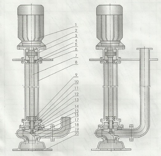 1、電機(jī);2、聯(lián)軸器;3、電機(jī)座;4、上軸承;5、上軸承座;6、安裝盤;7、加長(zhǎng)軸;8、支撐管;9、下軸承;10、上機(jī)械密封;11、油室;12、機(jī)械密封;13、后蓋板;14、鍵;15、葉輪螺母;16、葉輪;17、密封環(huán);18、泵體;19、出水管;20、底盤