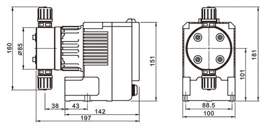 JLM電磁隔膜式計量泵是由微外理器控制、具有可以變沖程長度及頻率、電磁驅(qū)動的隔膜式計量泵。用于多種液體的計量輸送。電磁力驅(qū)動連桿帶動隔膜在泵頭內(nèi)做往復(fù)運動,引起泵頭膛腔體積和壓力變化,壓力的變化引起單向閥的自動開啟和關(guān)閉,實現(xiàn)化學(xué)藥品的定量吸入和排出。泵的出口排量可以根據(jù)沖程長度調(diào)節(jié)鈕和沖程頻率選擇開關(guān)調(diào)節(jié),沖程長度佳調(diào)節(jié)范圍20%~100%。數(shù)碼管顯示各種運行狀態(tài)和報警。